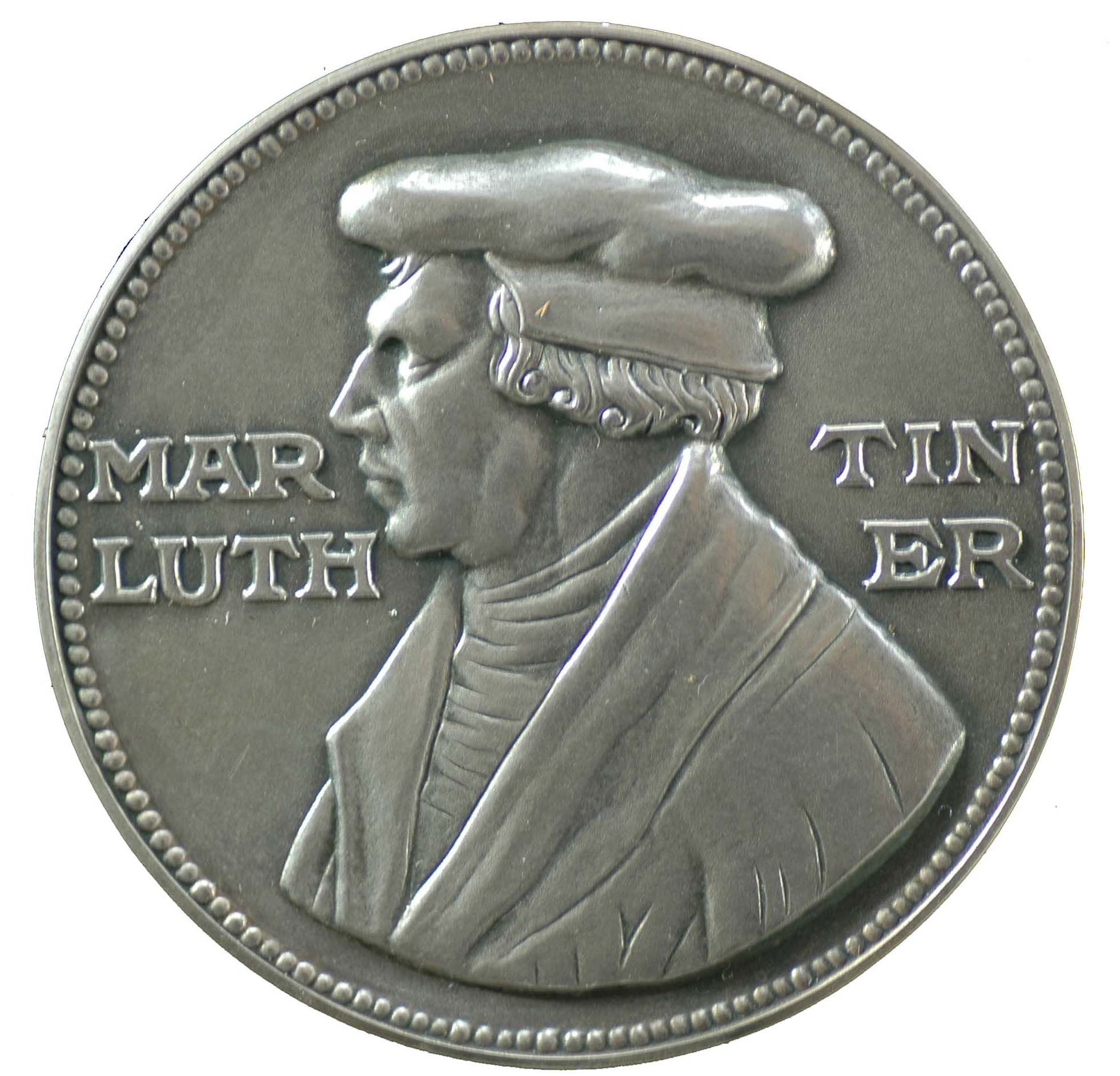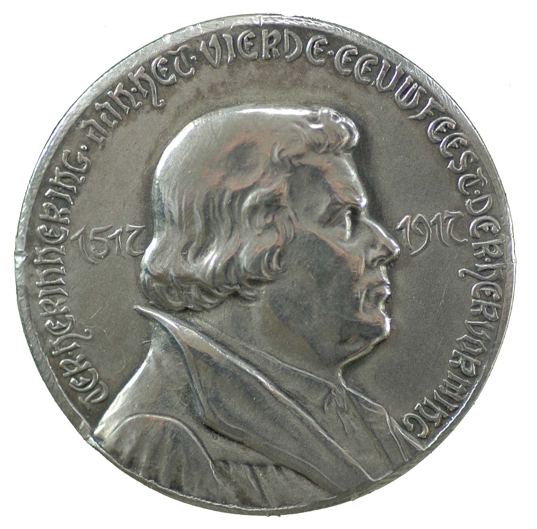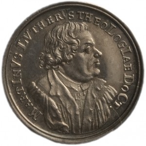 1717, Op het tweede eeuwfeest van de Hervorming, vz: borstbeeld Martin Luther, met als rand en jaarschrift: MartInVs LVutherVs theoLogIae DoCtor/Martin Luther dokter in de godgeleerdheid. (M, D, C, 2xL, 3xV, 2xI – 1717). Onder het borstbeeld: Verbum domini manet in aeternum/ kz: afbeelding van de stad Jeruzalem. Als randschrift: eCCe sVper te orIetVr DoMInVs/zie de Heer zal over u opgaan (1717). Afsnede: alter post emenData sa Cra annVs IVbILaeVs (1717)/het tweede eeuwjaar na de kerkhervorming. Medailleur: G.W.Vestner, zilver