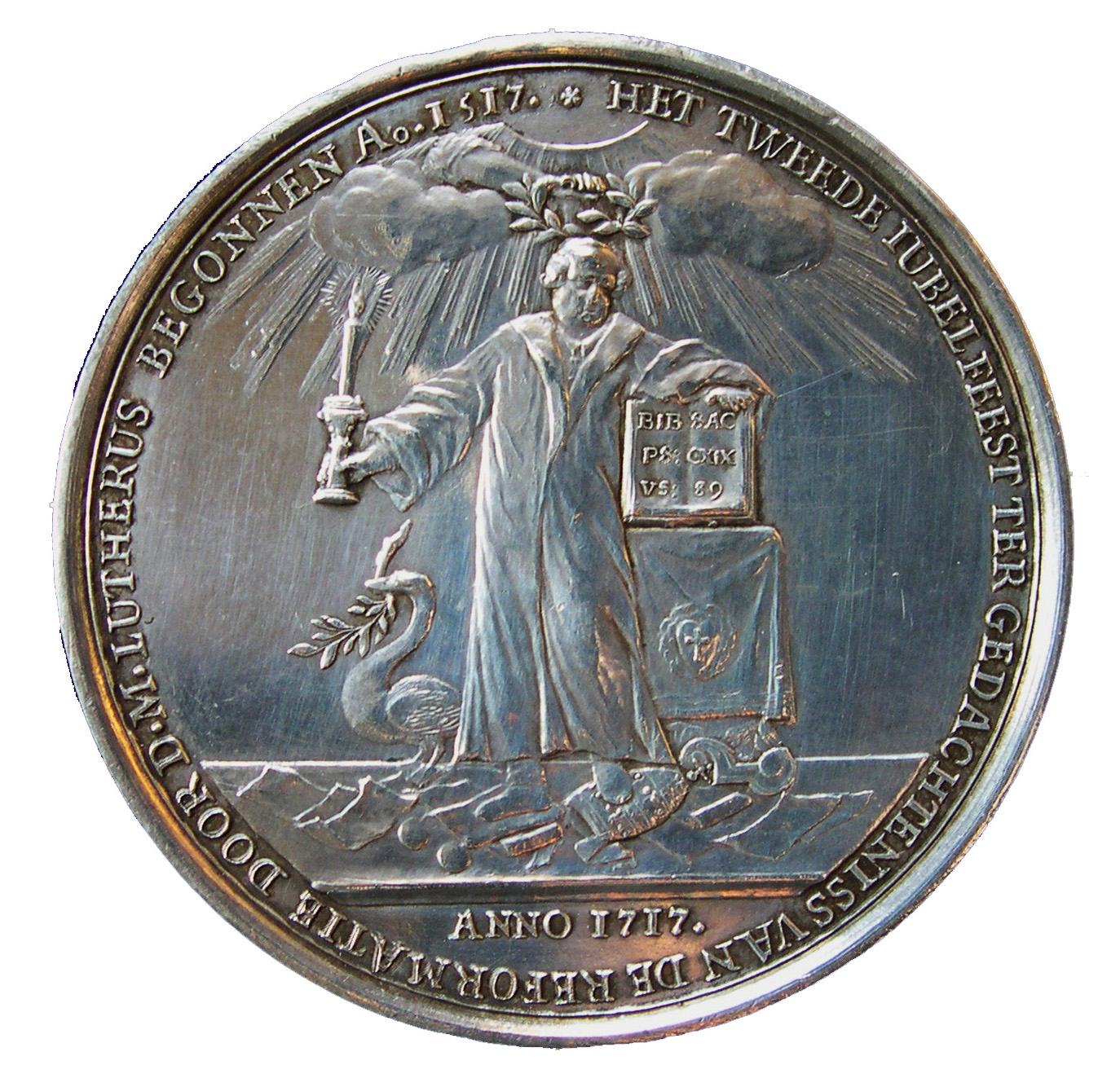 1717, Op het tweede eeuwfeest van de Hervorming, vz: Martin Luther met zwaan als zijn symbool naast zich en met kaars en bijbel, onder zijn voeten de pauselijke tiara en de banbul. Omschrift: Het tweede jubelfeest ter gedachteniss van de reformatie door D.M.Lutherus, begonnen Anno 1517. Op de bijbel staat: Bib Sac, Ps CXIX, vs 89 (Biblia Sacra/Heilige Schrift) en Psalm 119:89 “Heer, voor eeuwig staat uw woord in de hemel vast”. kz: vrouwe de Waarheid breekt het juk van de zittende vrouw, die de kerk voorstelt. Verder de tekst uit Mattheus 16:18: Op desen rots-steen wil ik bouwen myne gemeente, en de poorten der helle sullen se niet overweldigen. Medailleur; Willem De Wijs, zilver 48 en 61 mm.