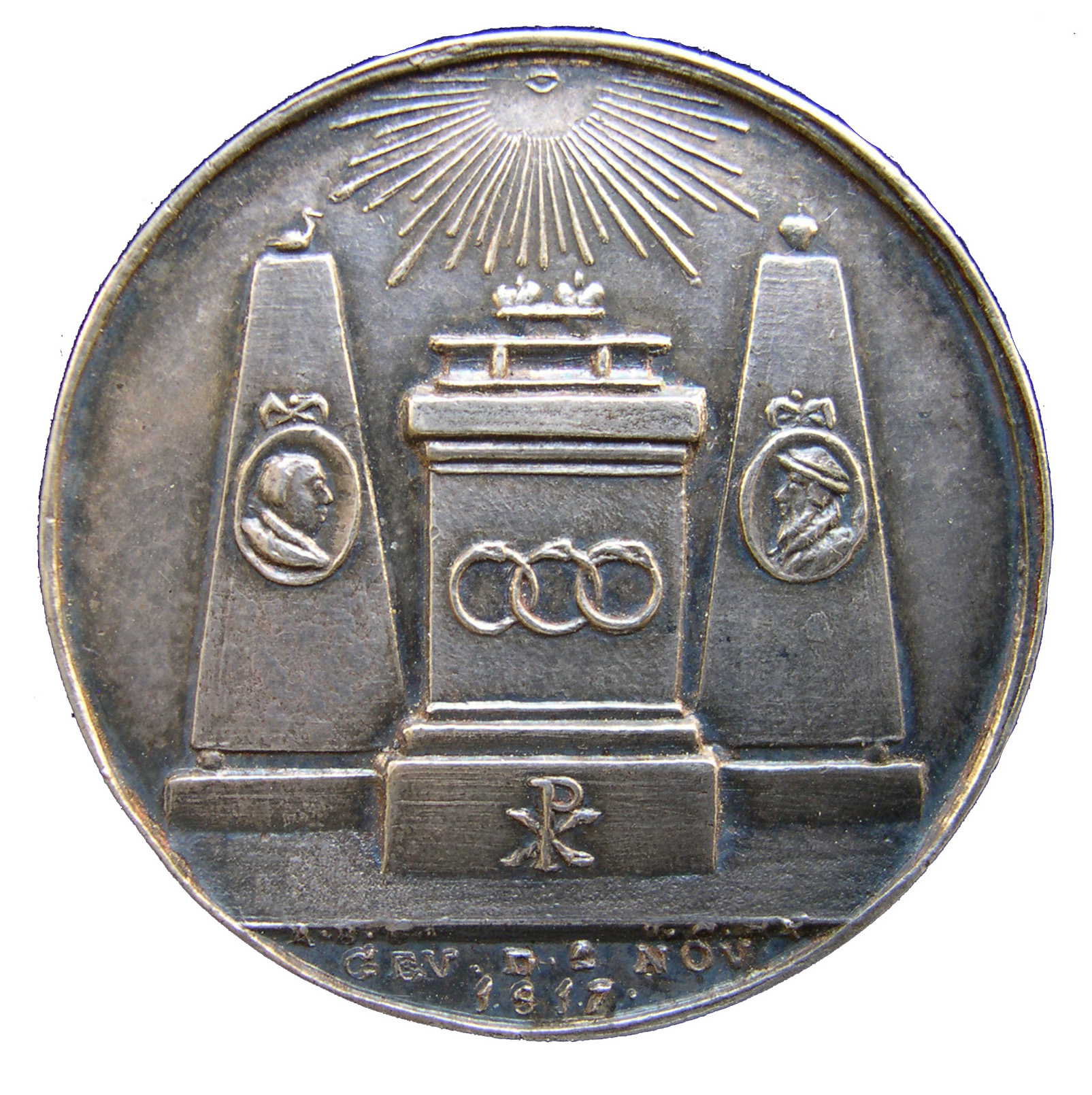 1817, Commemorating the tricentennial of the Reformation, two obelisks with the portraits of Luther and Melanchton, reverse: Ter gedachtenis van het derde eeuwfeest van de hervorming(Commemorating the bicentennial of the Reformation). Medallist: A. Bemme, silver and bronze, 30 mm.